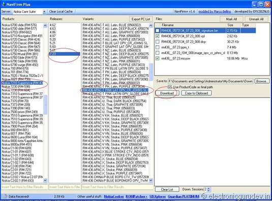 3. Open Navifirm select your Phone Model and Code and wait for a while until it loads “Releases” select a suitable release. Again wait until Navifirm loads “Variants” (i.e. Product code of the phone which you can find at the sticker usually below battery)